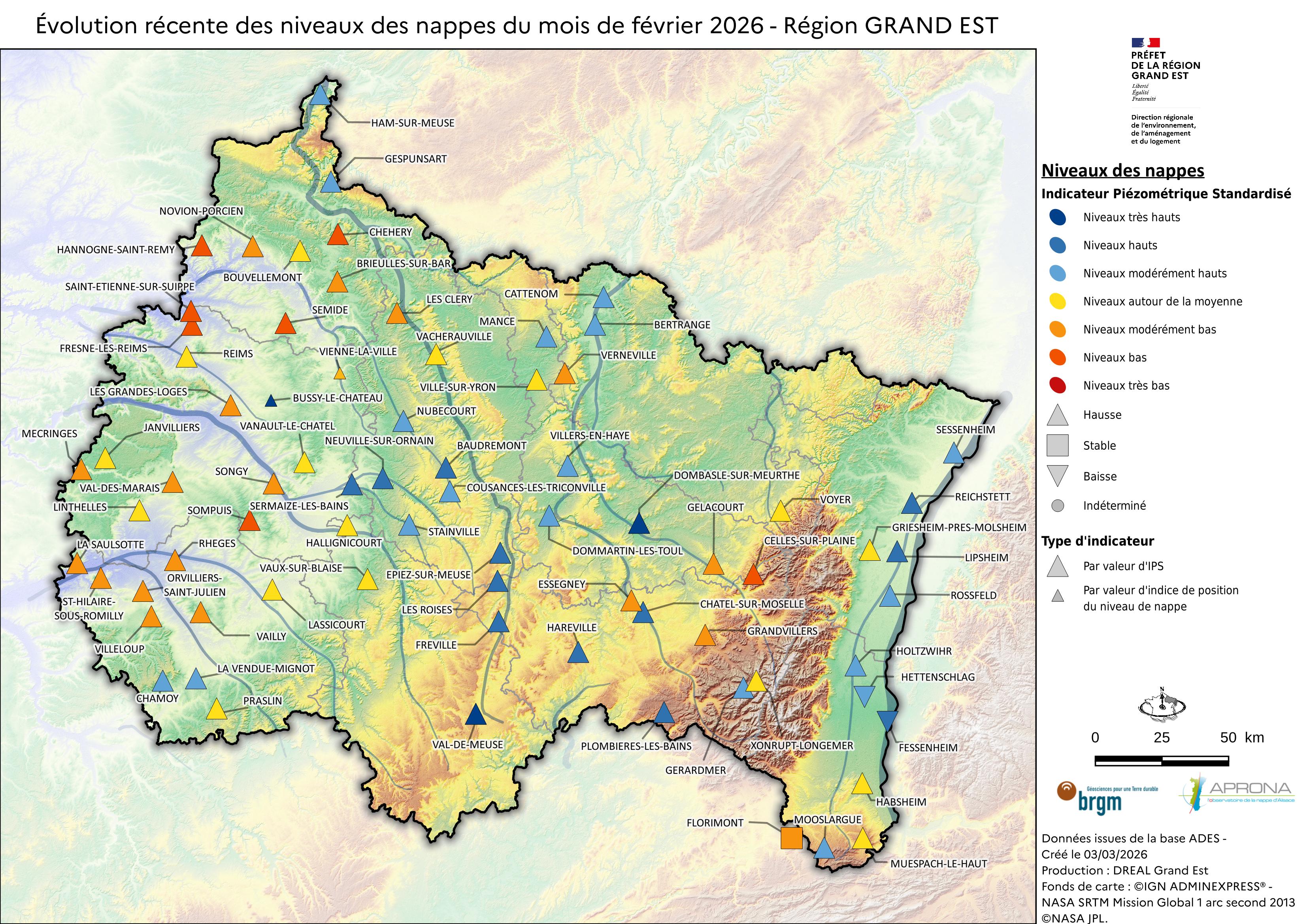 Concernant les eaux souterraines, suite à l’épisode de précipitations du mois de février, la région se trouve dans une situation plus favorable que le mois précédent, les tendances à la hausse s’étant généralisées indiquant une redynamisation de la recharge hivernale sur l’ensemble du territoire. Pour les nappes les plus réactives, la majorité des niveaux moyens mensuels sont remontés d’au moins une classe. Les nappes plus inertielles présentent une évolution des niveaux moins spectaculaire mais néanmoins globalement positive.
