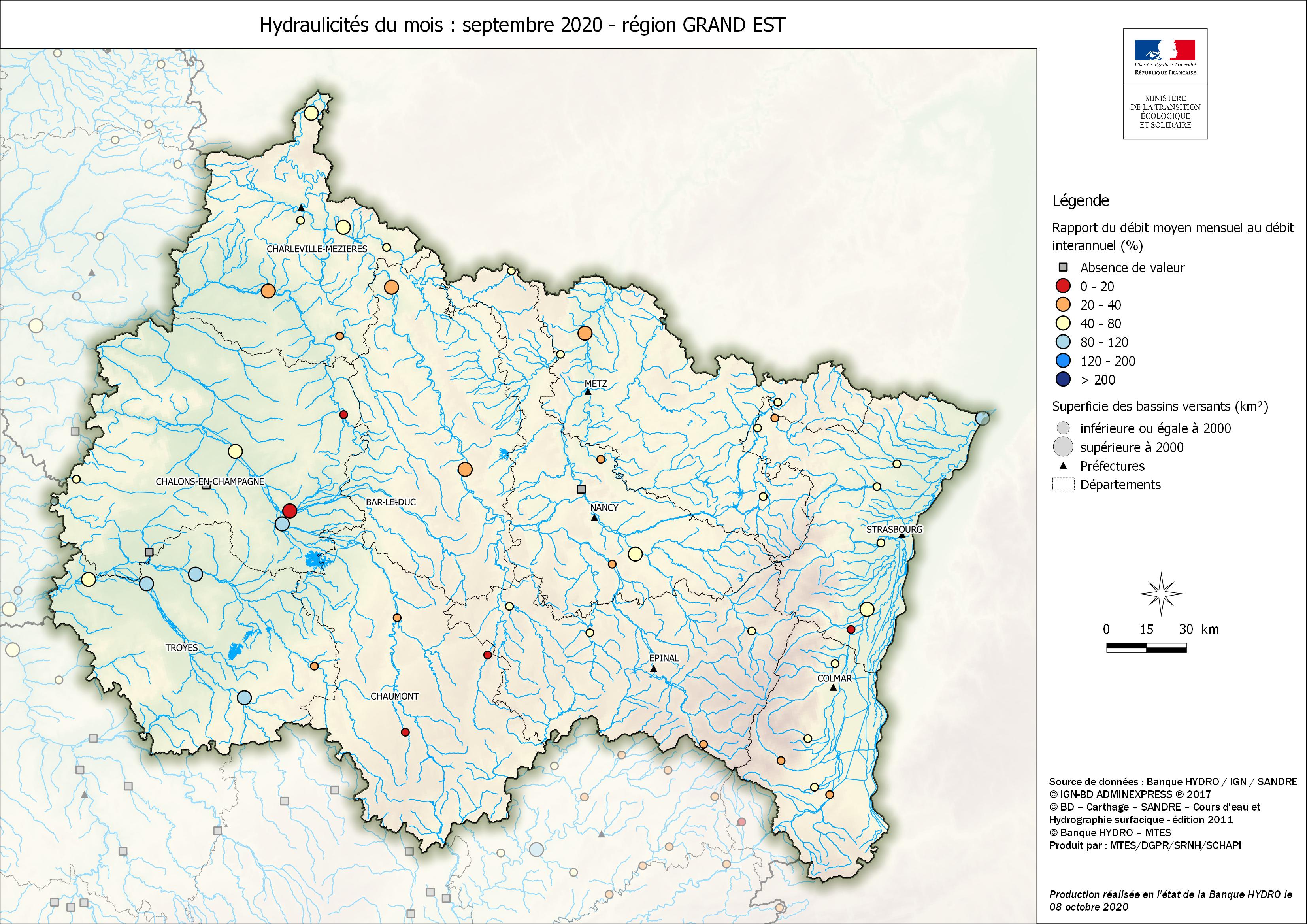 Sur le bassin Rhin-Meuse, les précipitations de ce mois de septembre affichent encore un déficit, sensiblement plus marqué en Alsace (déficit de plus de 40%) qu’en Lorraine (déficit de l’ordre de 20%). Seul le secteur nord ardennais est concerné par des cumuls supérieurs aux normales de saison. Ce manque d’eau quasi généralisé qui touche les bassins Meuse et Moselle depuis plusieurs mois consécutifs continue à impacter significativement les écoulements dans les cours d’eau. Les débits moyens mensuels (QMM) restent comme au mois précédent partout sensiblement inférieurs aux normales de saison, avec une hydraulicité encore inférieure à 0.4 sur toute la Moselle et sur la Meuse médiane. Les débits minimaux sur trois jours consécutif (VCN3), qui ont été relevés avant les pluies de la dernière décade de septembre sont eux aussi représentatifs du déficit pluviométrique cumulé important. Ils sont partout inférieurs au médian avec environ la moitié des stations qui affichent des périodes de retour dépassant le décennal sec.