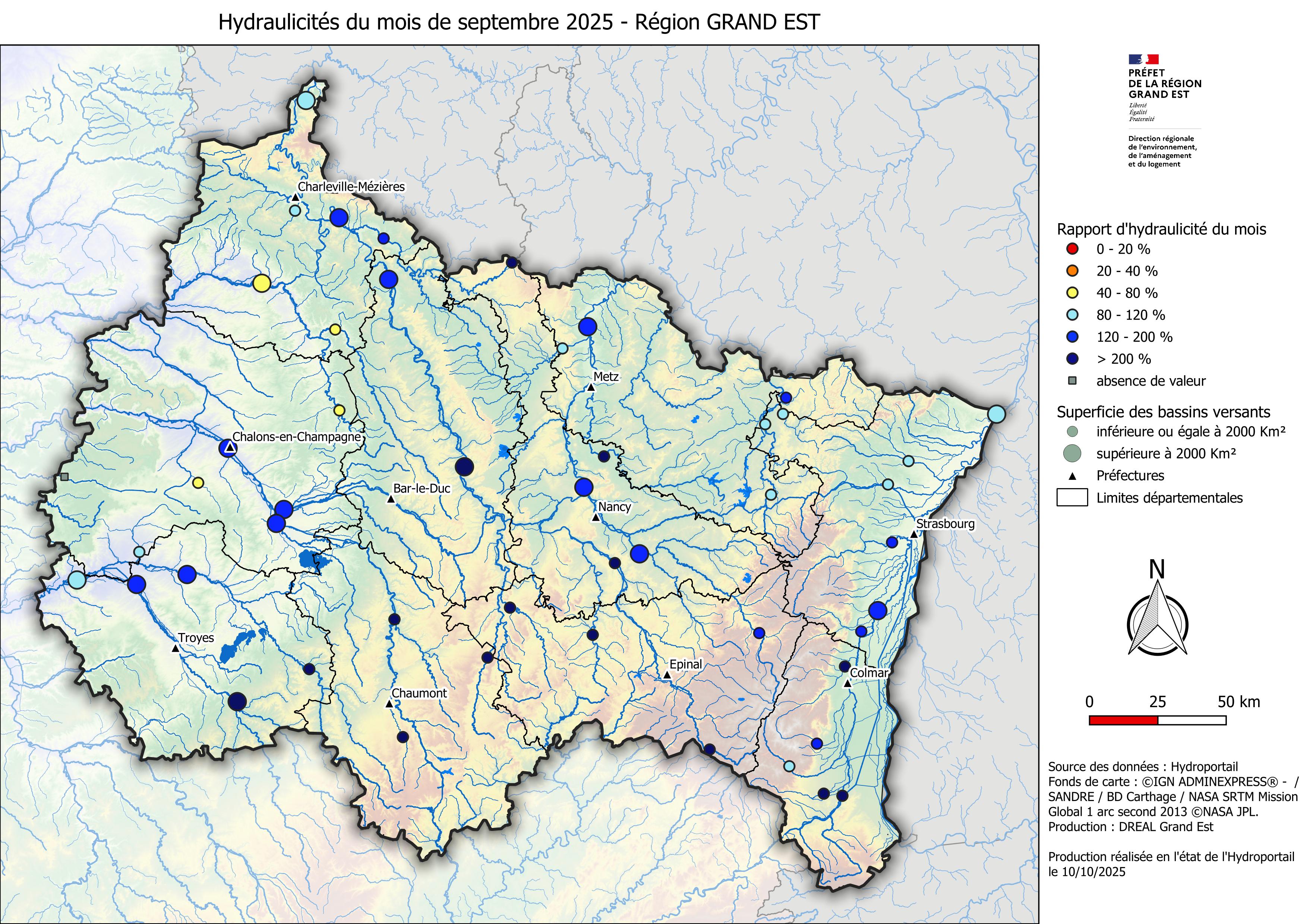 Sur le bassin de la Moselle, les cumuls de précipitations observés durant le mois de septembre 2025 sont supérieurs aux moyennes interannuelles. Sur toute la partie amont du bassin, l’hydraulicité est nettement à la hausse par rapport au mois dernier, et les stations présentent toutes une hydraulicité excédentaire. Seul le bassin de l’Orne (qui était le plus déficitaire le mois dernier) présente une l’hydraulicité proche de la normale.
