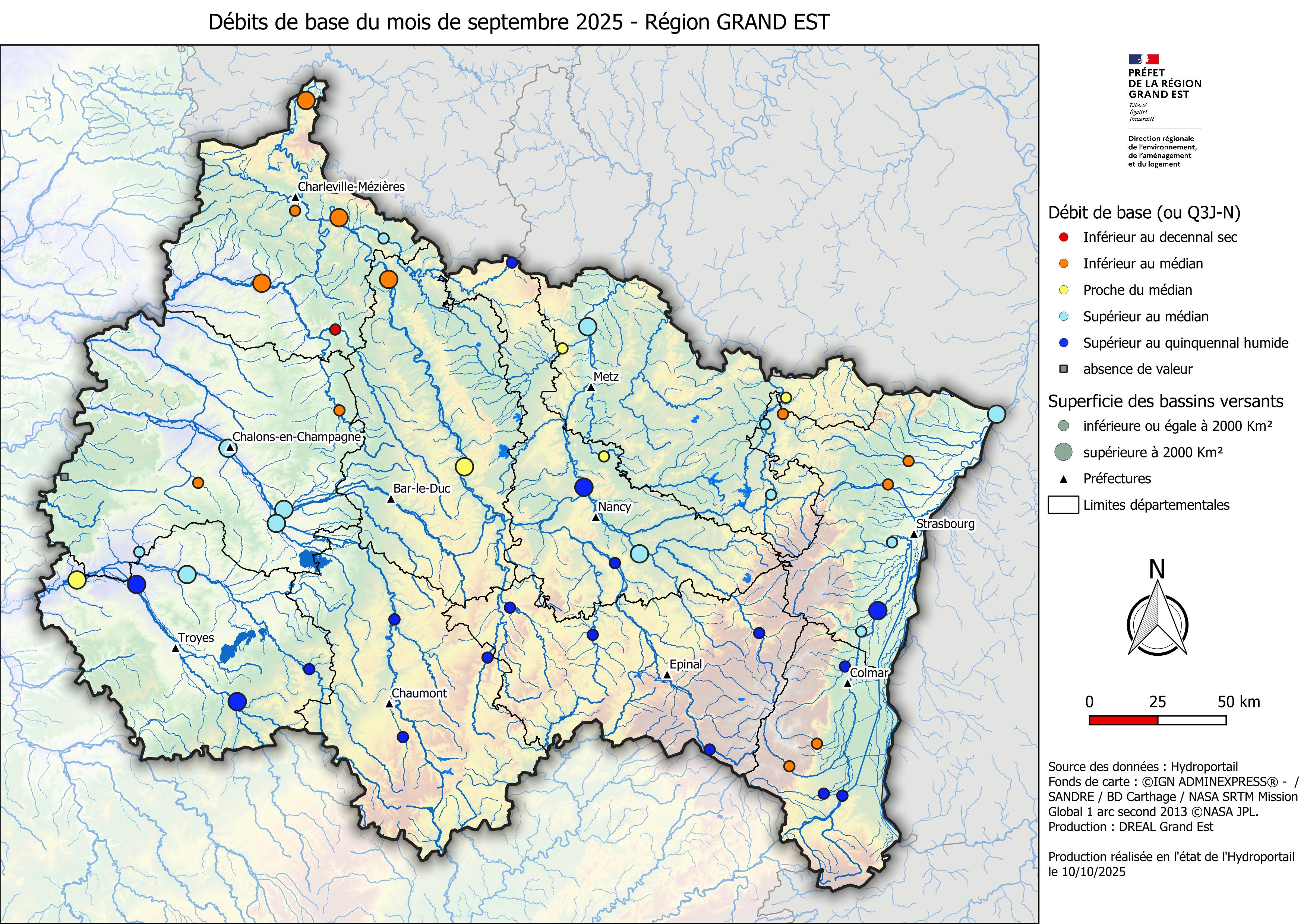 En ce qui concerne les débits minimaux sur trois jours consécutifs (Q3J-N) en septembre, ils sont très hétérogènes et majoritairement supérieurs au quinquennal humide.