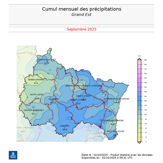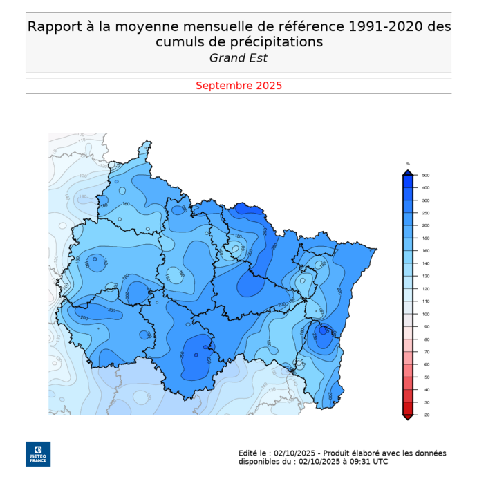 Sur le bassin du Rhin, les cumuls de précipitations observés durant le mois de septembre 2025 sont largement supérieurs aux moyennes interannuelles.