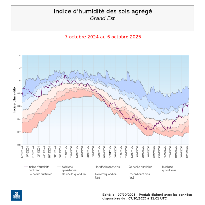 Concernant les eaux souterraines, les pluies importantes du mois de septembre, associées à la baisse des températures et au ralentissement de l’activité de la végétation améliorent l’humidité des sols et l’efficacité des pluies sur les nappes réactives.