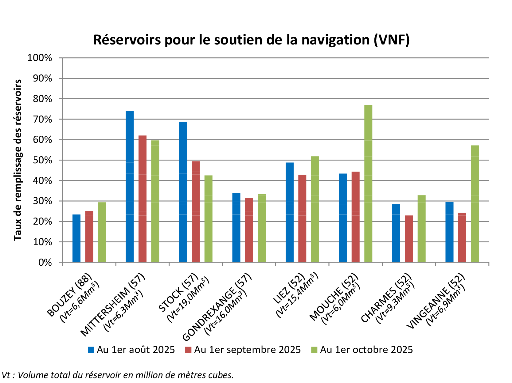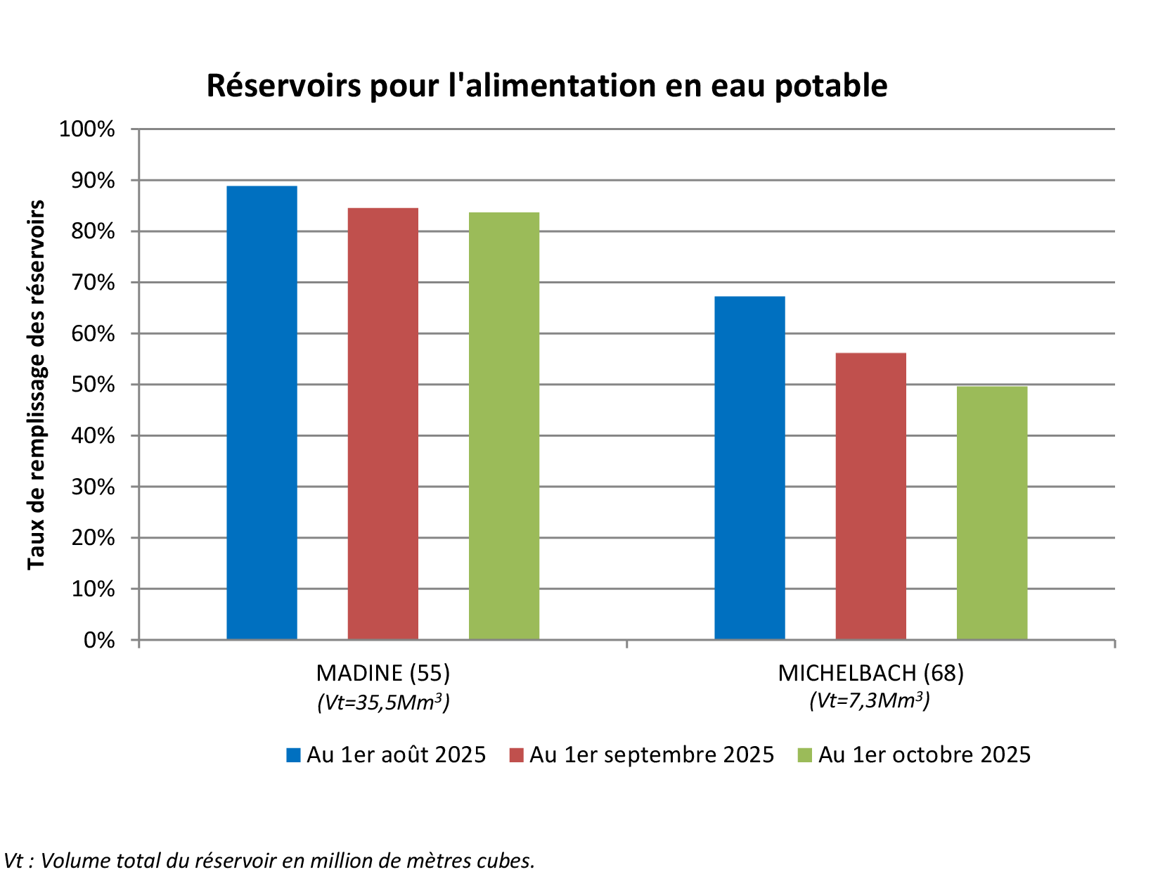 Pour les réservoirs et barrages de la région Grand Est, le niveau de remplissage fin septembre 2025 est de plus de 45% pour les retenues destinées à la navigation. En ce qui concerne les retenues destinées à l’alimentation en eau potable, le réservoir de Madine et la retenue de Michelbach affichent un taux de remplissage de plus de 78%.