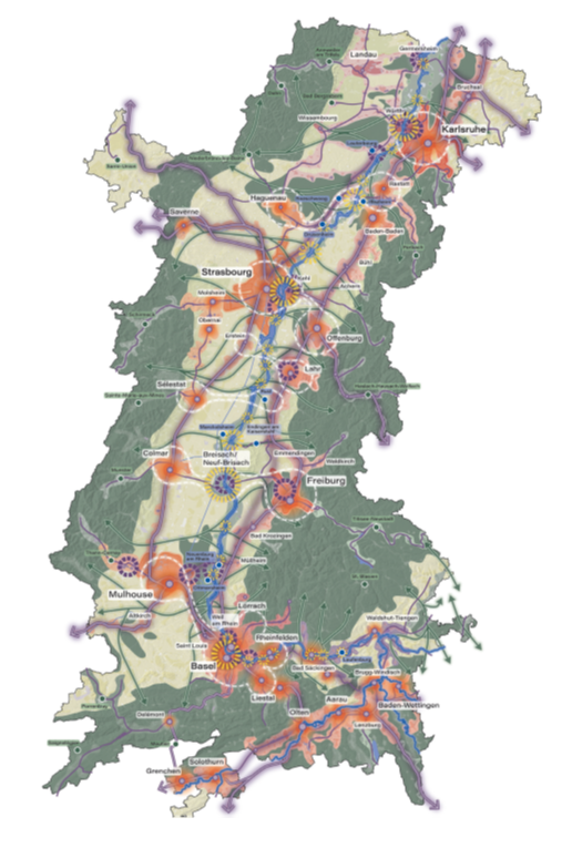 Au terme d’une démarche de 3 années, le comité directeur de la conférence du Rhin supérieur (CRS) a adopté en juin 2025 son projet de territoire. Il propose une vision du territoire et un cadre d’orientations stratégiques non opposables juridiquement mais inspirantes notamment pour les autorités planificatrices de l’aménagement et de l’urbanisme, et ambitionne de susciter des débats et des projets pour le développement équilibré et durable de l’espace transfrontalier.
