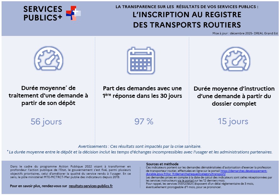 Vous trouverez ci-après les indicateurs de transparence relatifs à l’inscription au registre des entreprises de transport par route en région Grand Est.