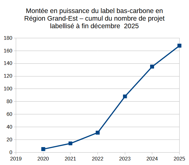 Au 1er janvier 2026, on dénombre 168 projets labellisés bas-carbone et 445 sous-projets en région Grand-Est, représentant plus de 1 105 450 de crédits carbone estimés, ce qui équivaut à l’impact CO2 d’une voiture ayant fait plus de 127 000 fois le tour de la terre.
