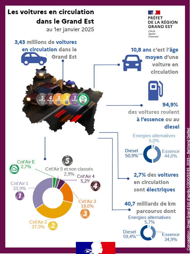 Au 1er janvier 2025, 3,43 millions de voitures sont en circulation dans le Grand Est, en légère augmentation par rapport à 2024. Leur âge moyen est de 10,8 ans, lui aussi en légère augmentation. La part des voitures diesel thermique dans le parc, à 50,9%, poursuit sa tendance à la diminution tandis que les motorisations alternatives (électrique, hydrogène, hybride rechargeable, bicarburation essence-GPL) représentent 5,0 % du parc, en augmentation sur un an. Le parc des voitures en circulation ayant un classement Crit’Air au moins égal à 3 (26.1 %) diminue.